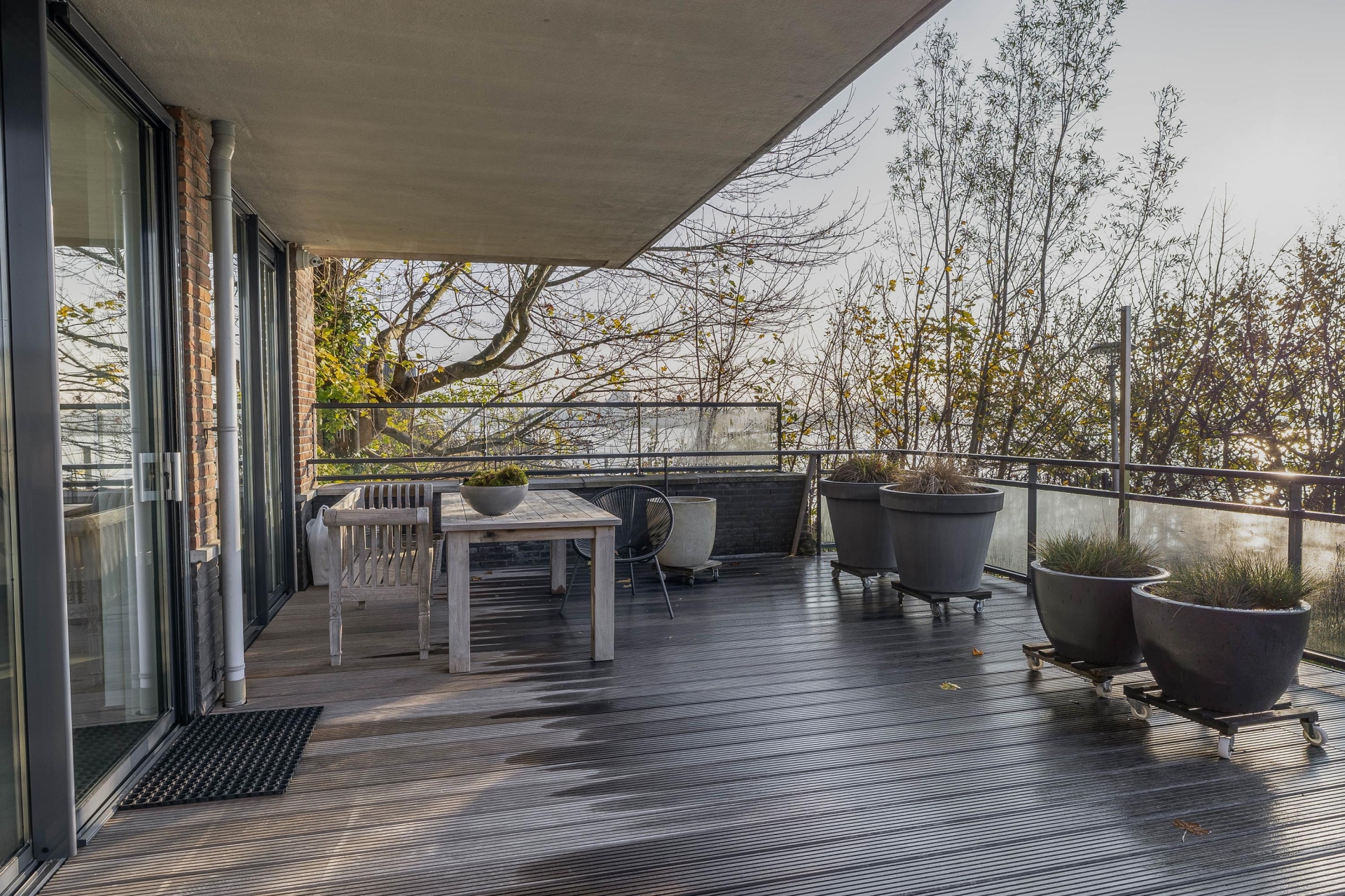 Een van de absolute hoogtepunten van dit appartement is het ruime terras van maar liefst ca. 37m2 dat direct aan de woonkamer grenst. Dankzij de ligging op het zuiden geniet je hier van zon vanaf het middaguur tot in de avond. Het terras is voorzien van houten vlonders, plantenbakken en genoeg ruimte voor een grote loungeset én eettafel. Ideaal voor een zomerse borrel, diner in de buitenlucht of gewoon genieten van het rustgevende uitzicht over het water en het groen.