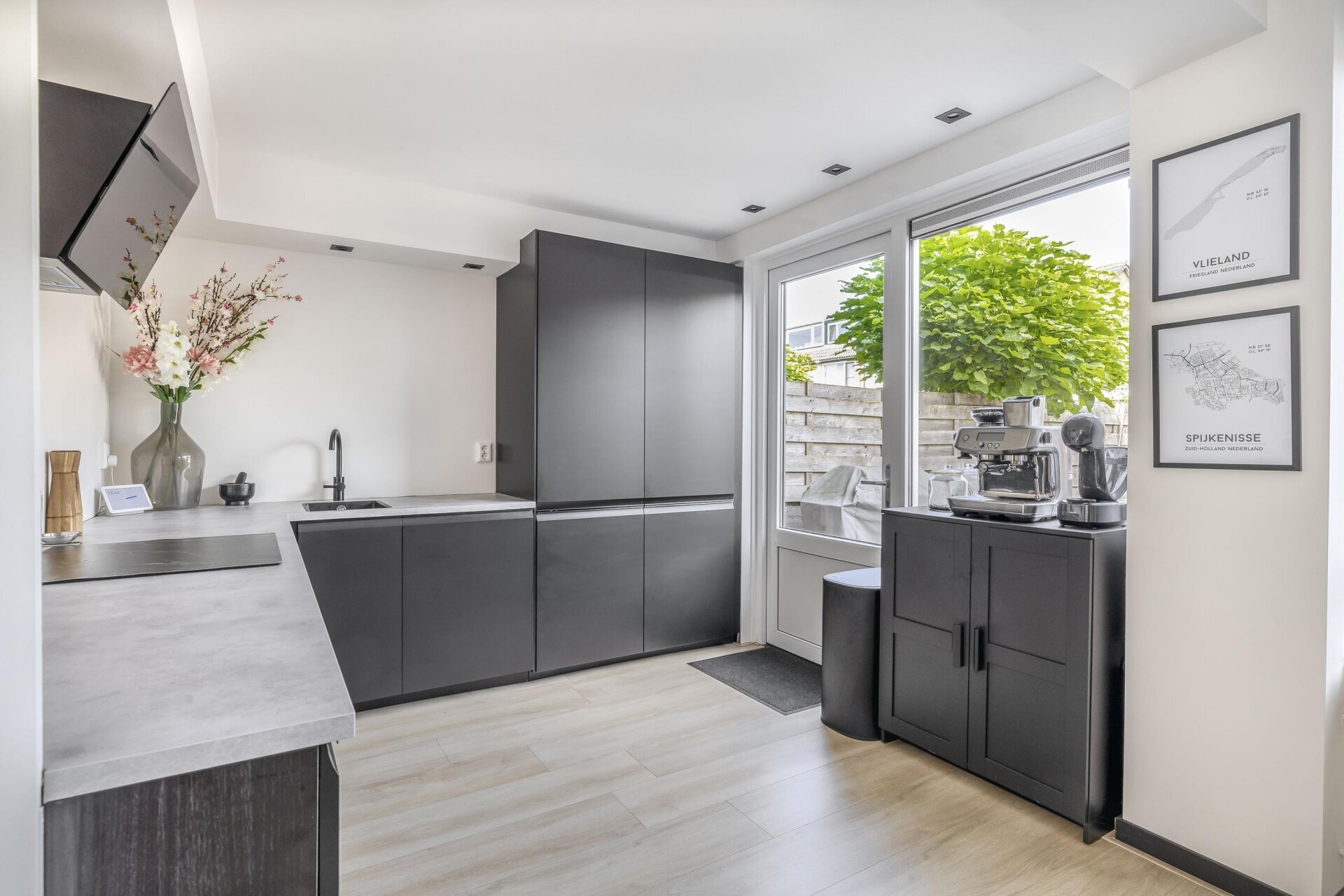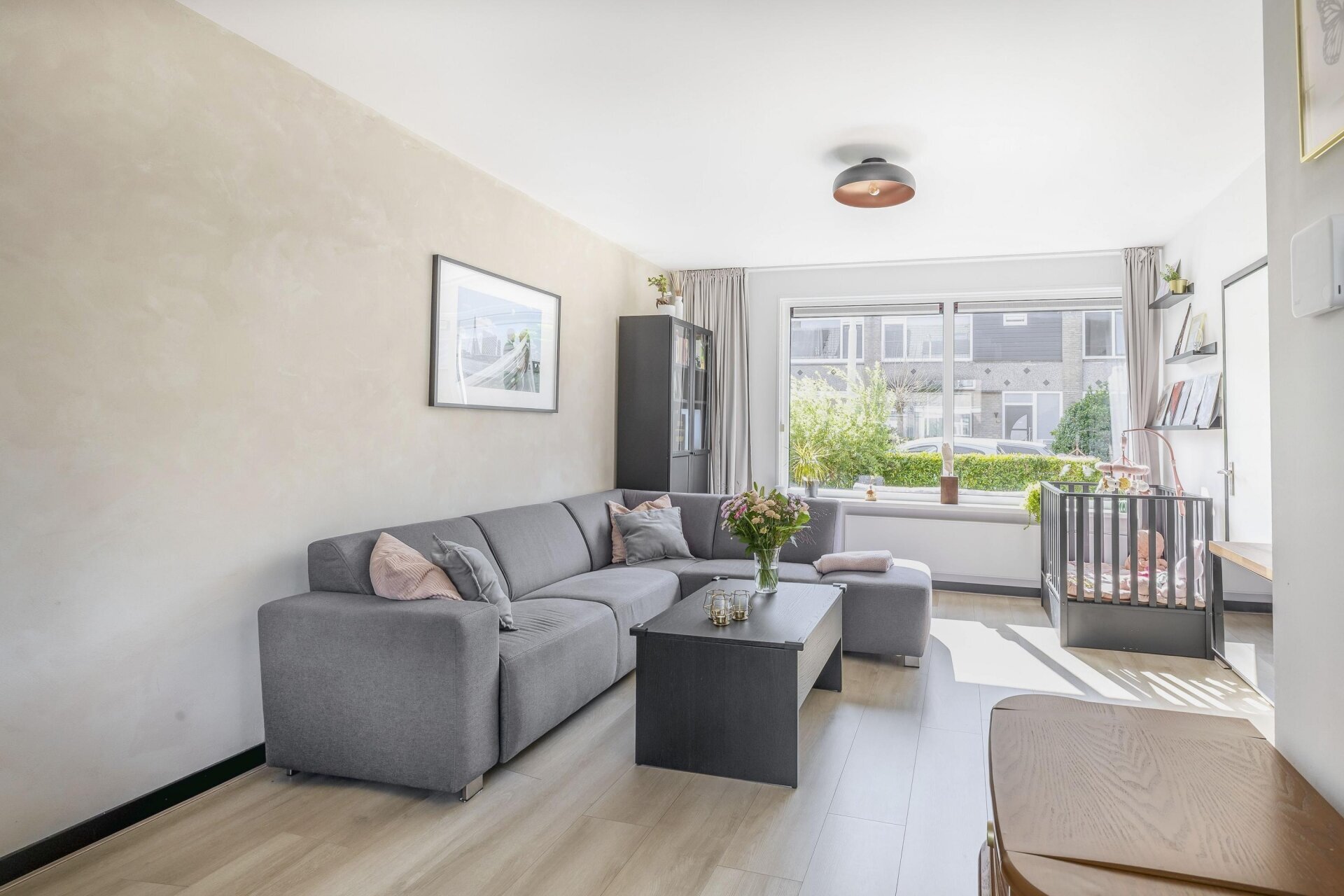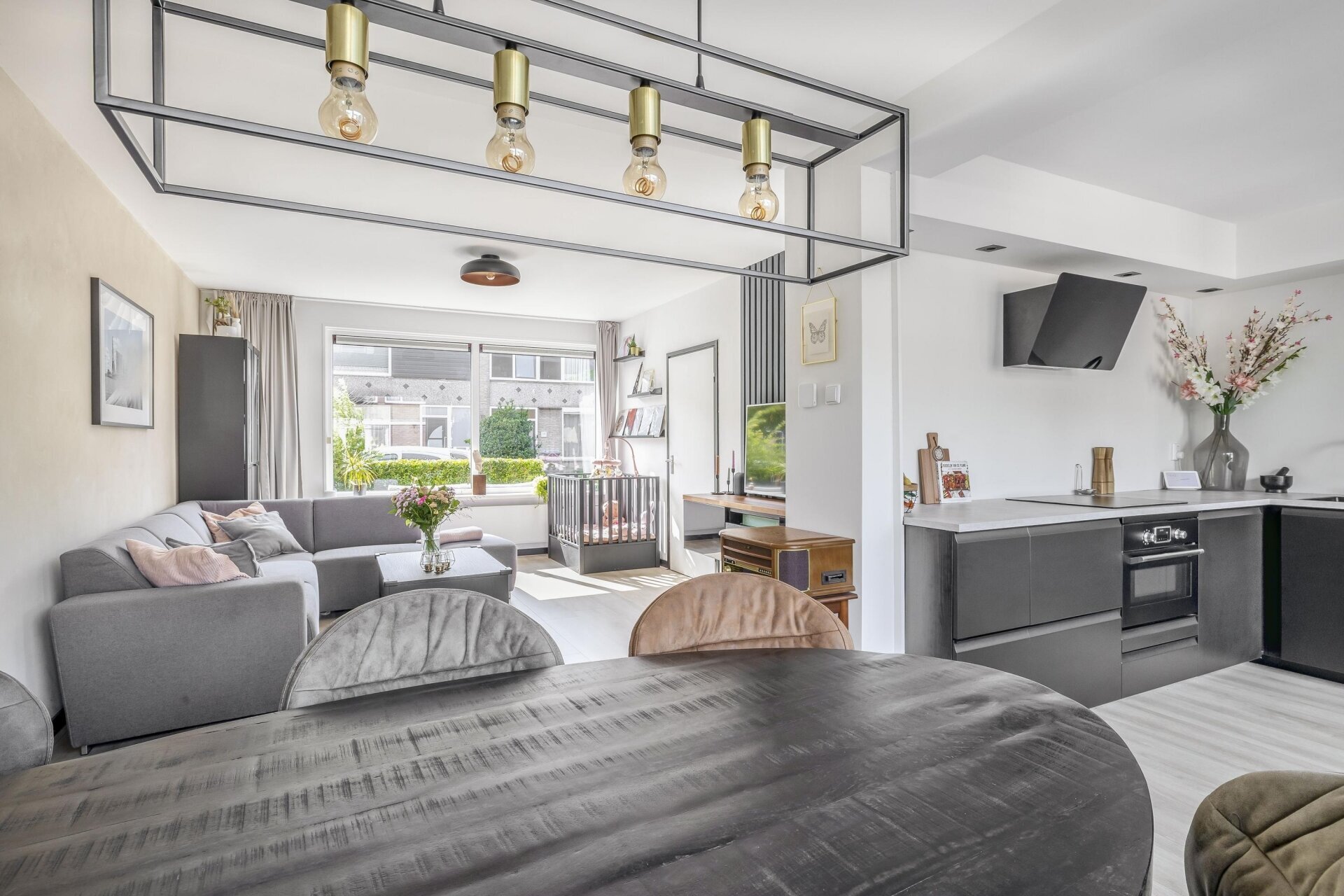 De woonkamer is ruim en licht en heeft een prettige indeling die direct uitnodigt om te ontspannen. De moderne vloer loopt door tot in de keuken, waardoor het geheel strak en ruimtelijk oogt. Aan de voorzijde kijk je uit op een rustig straatbeeld, terwijl je aan de achterzijde via de keuken zó de tuin inloopt. De nieuwe keuken (2024) is een absolute blikvanger: strak vormgegeven met greeploze fronten, hoogwaardige inbouwapparatuur en veel bergruimte – hier wil je koken!