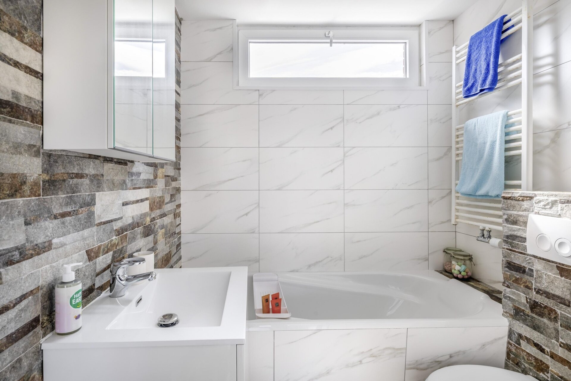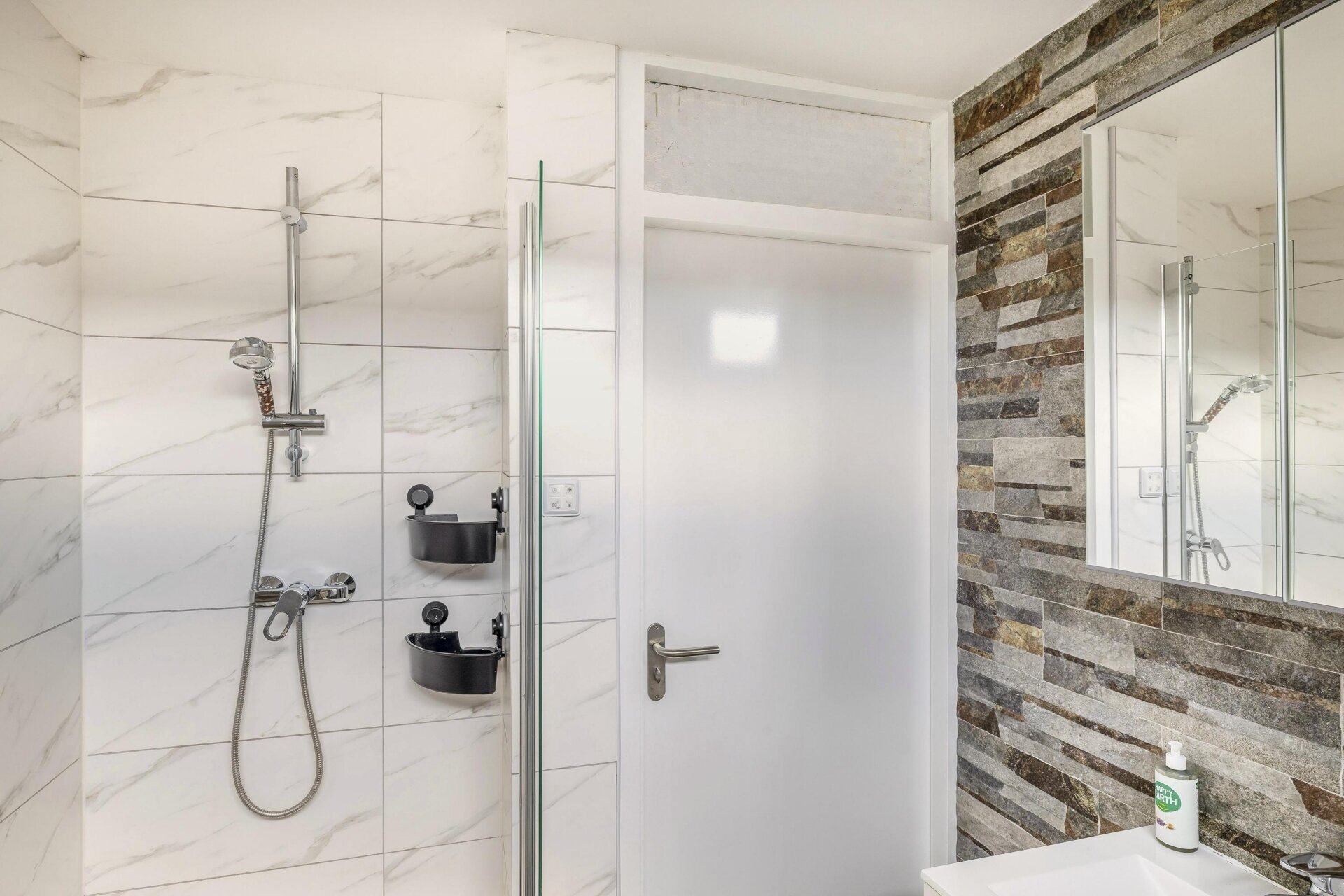 De badkamer is in 2020 volledig vernieuwd en heeft een frisse, moderne uitstraling. Voorzien van een ligbad, inloopdouche, wandcloset, wastafelmeubel en designradiator – hier begin je je dag ontspannen. Ook het separate toilet op de begane grond is stijlvol en modern uitgevoerd.
