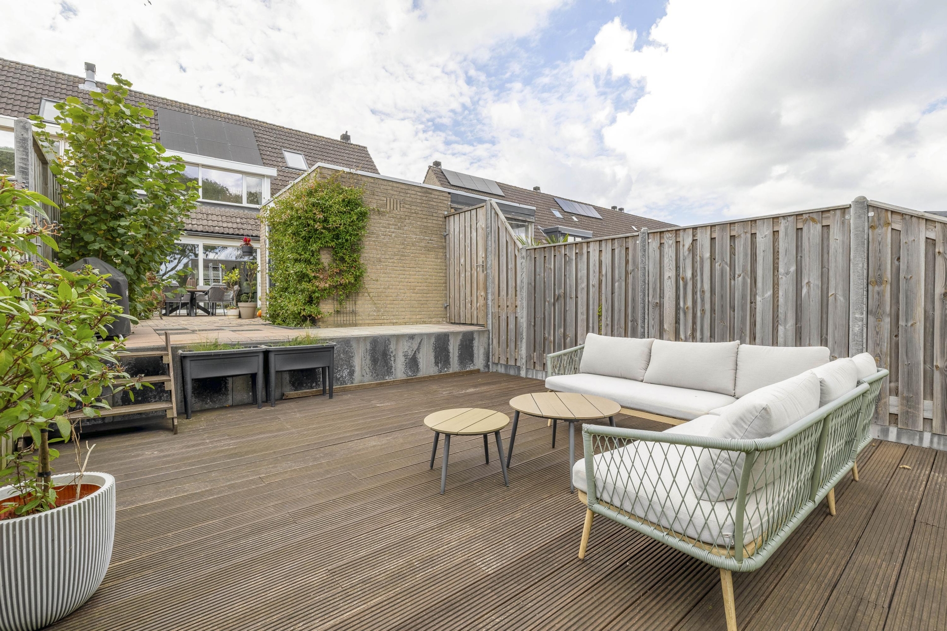 Aan de achterzijde ligt een bijzonder diepe tuin van bijna 18 meter, fraai aangelegd en goed onderhouden. De ligging op het oosten betekent dat je 's ochtends al van de zon kunt genieten tijdens je eerste kop koffie, maar door de diepte van de tuin kan je achterin de gehele dag genieten van de zon. Dankzij de vrije ligging aan de achterkant zit je hier bovendien heerlijk privé.