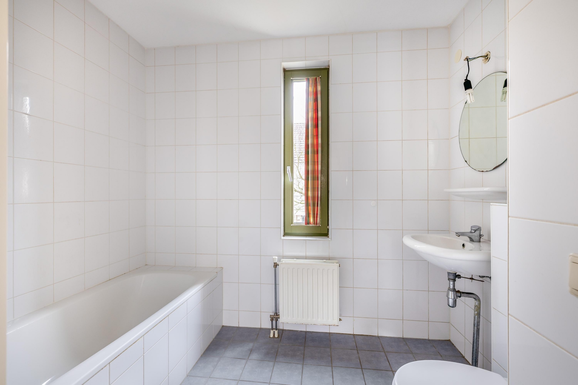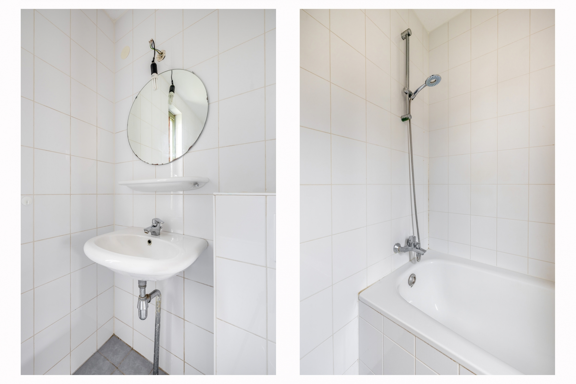 De badkamer is volledig betegeld en voorzien van een ligbad, wastafel en toilet. Ook hier is de uitvoering netjes, maar eenvoudig. Met een update maak je er eenvoudig een frisse, eigentijdse badkamer van die past bij de rest van je nieuwe thuis.