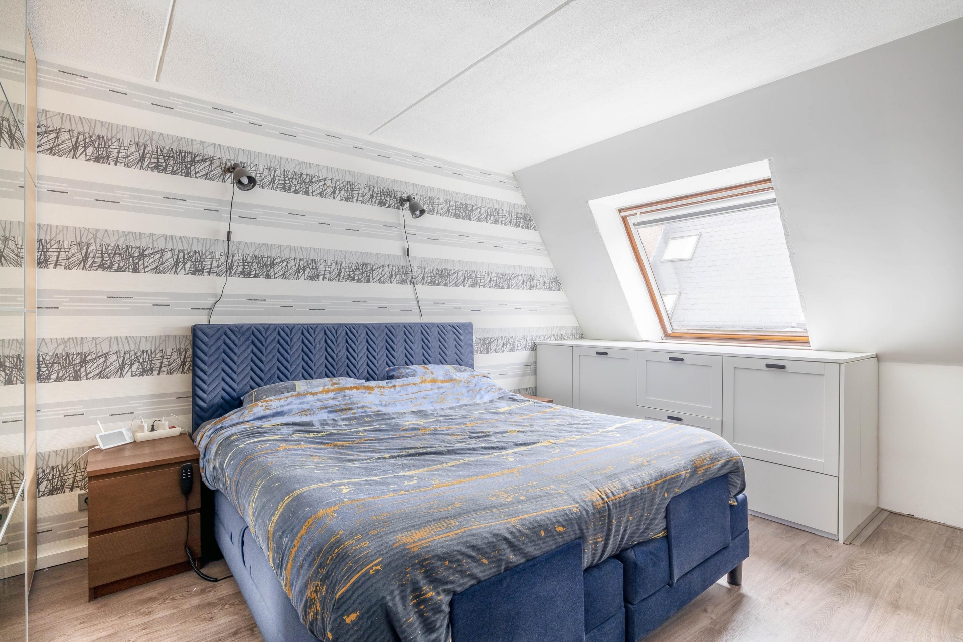 Overloop met toegang tot twee slaapkamers en de badkamer. De royale masterbedroom aan de voorzijde beschikt over een groot dakraam en een ingebouwde kast. De tweede slaapkamer is gelegen aan de achterzijde van de woning.