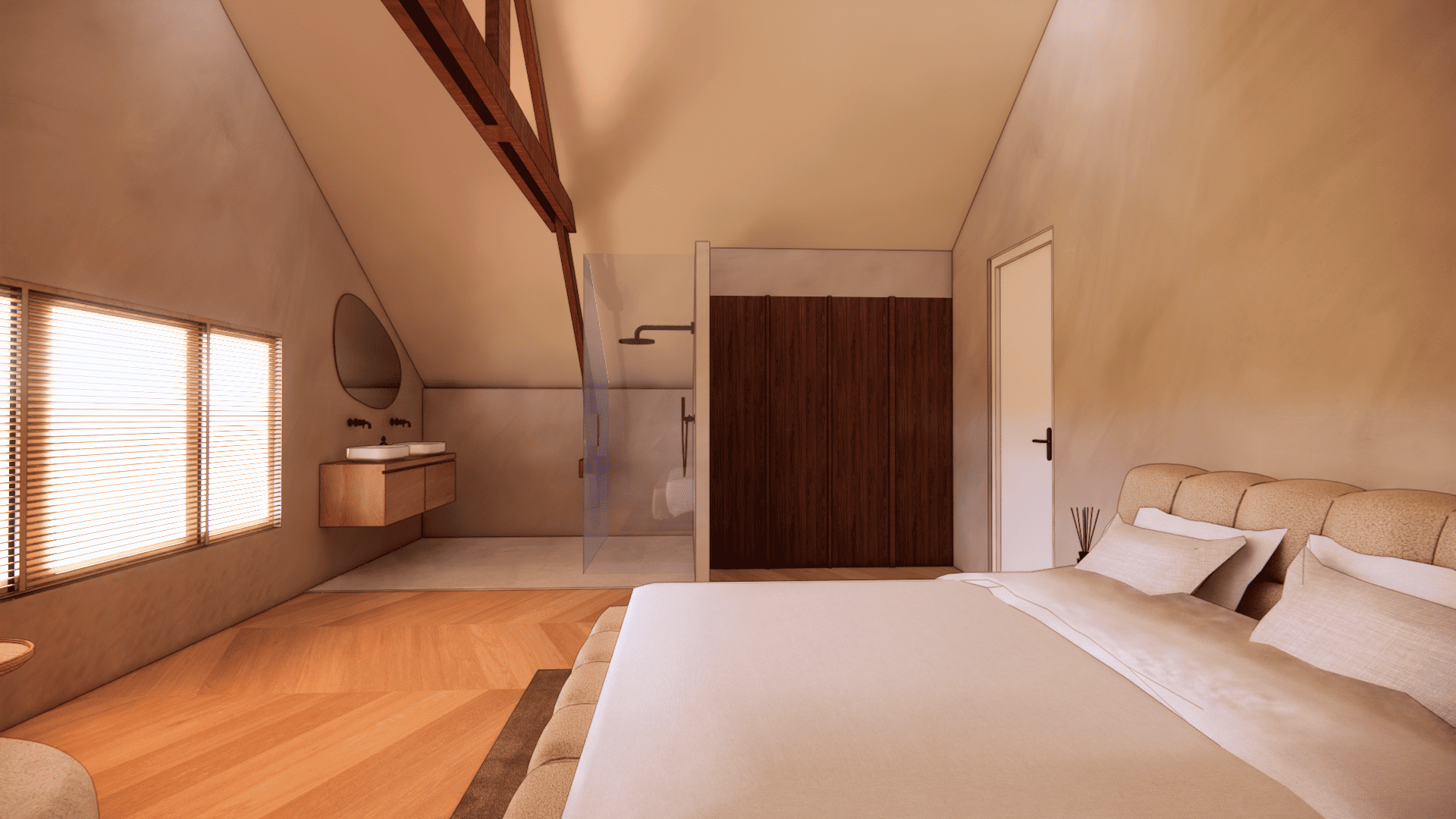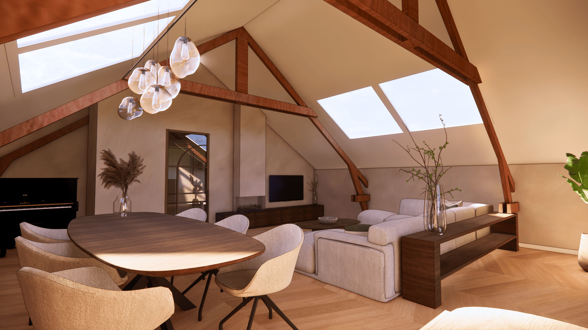 De verdieping laat zien wat hier mogelijk is: op basis van uitgewerkte 3D-visualisaties is een luxe loftstijl voorstel uitgewerkt met zichtbare houten spanten, dakramen voor daglicht, een open living met zithoek en eethoek, moderne keuken en een ruime slaapkamer met en suite badkamer. Alles in natuurlijke tinten, met warme materialen en slimme indeling. Of je het nu zelf gaat realiseren of laat uitvoeren, de inspiratie ligt er al.