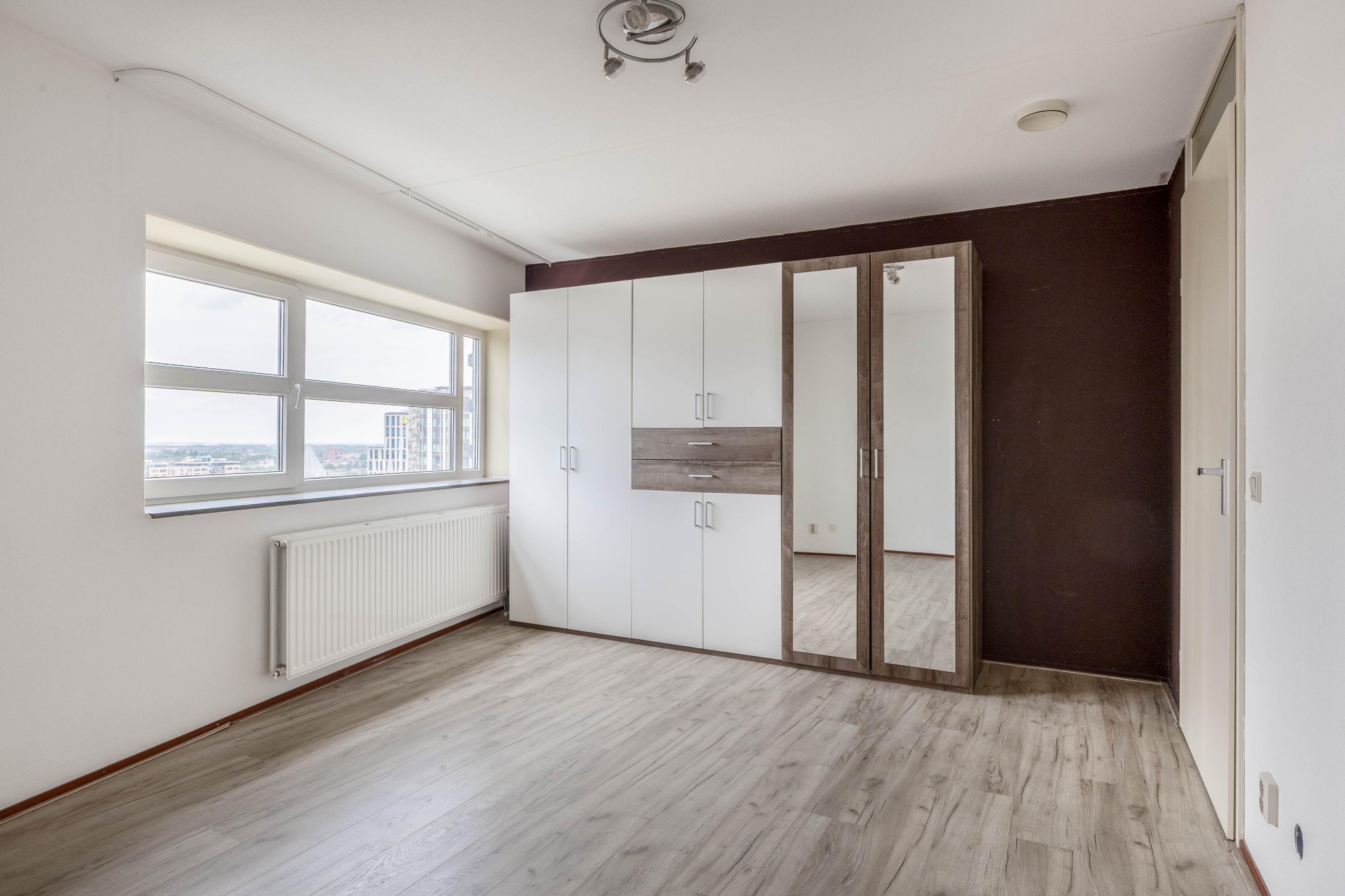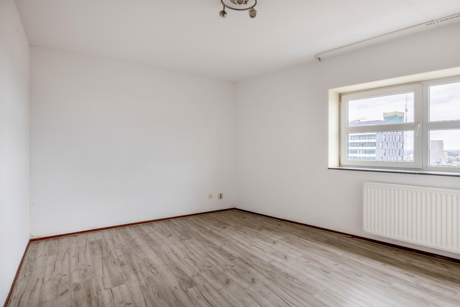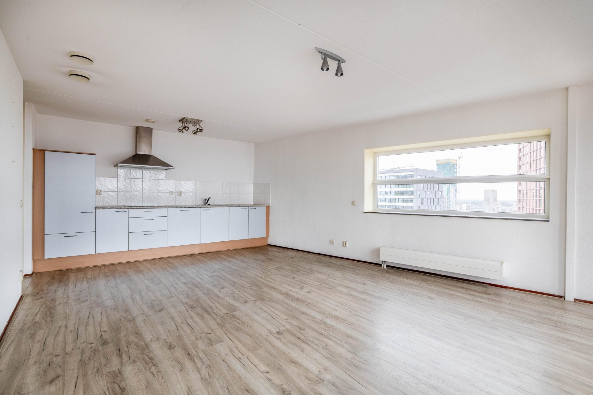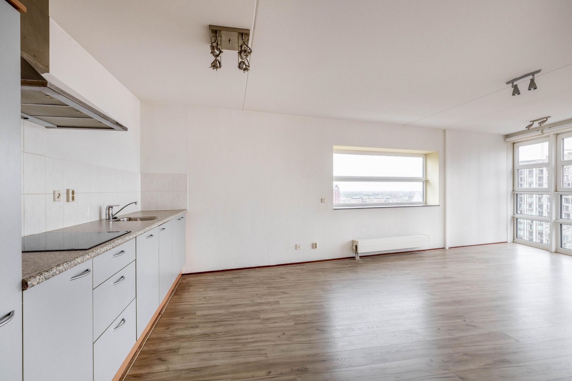 De woonkamer is het hart van het huis. De open indeling zorgt voor een ruimtelijk gevoel en maakt het makkelijk om verschillende hoekjes te creëren – een gezellige zithoek, een eethoek met uitzicht of misschien een werkplek aan het raam. De keuken is voorzien van een inductiekookplaat, afzuigkap en vaatwasser, en biedt volop mogelijkheden om naar eigen smaak te moderniseren. Dankzij de ligging op hoogte is het altijd rustig, ondanks dat je midden in het centrum woont. Geen balkon? Klopt – maar met zo’n panorama door de ramen voelt het alsof de stad je eigen voortuin is.