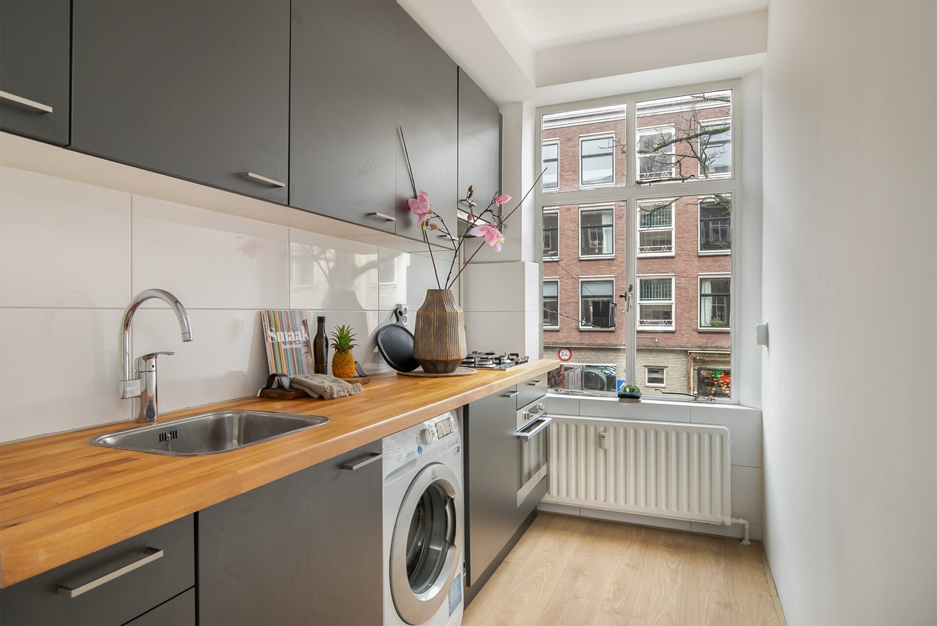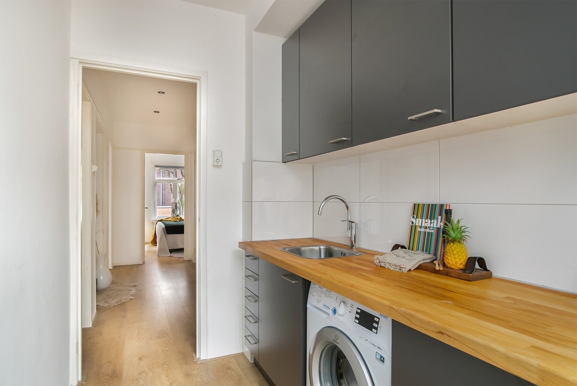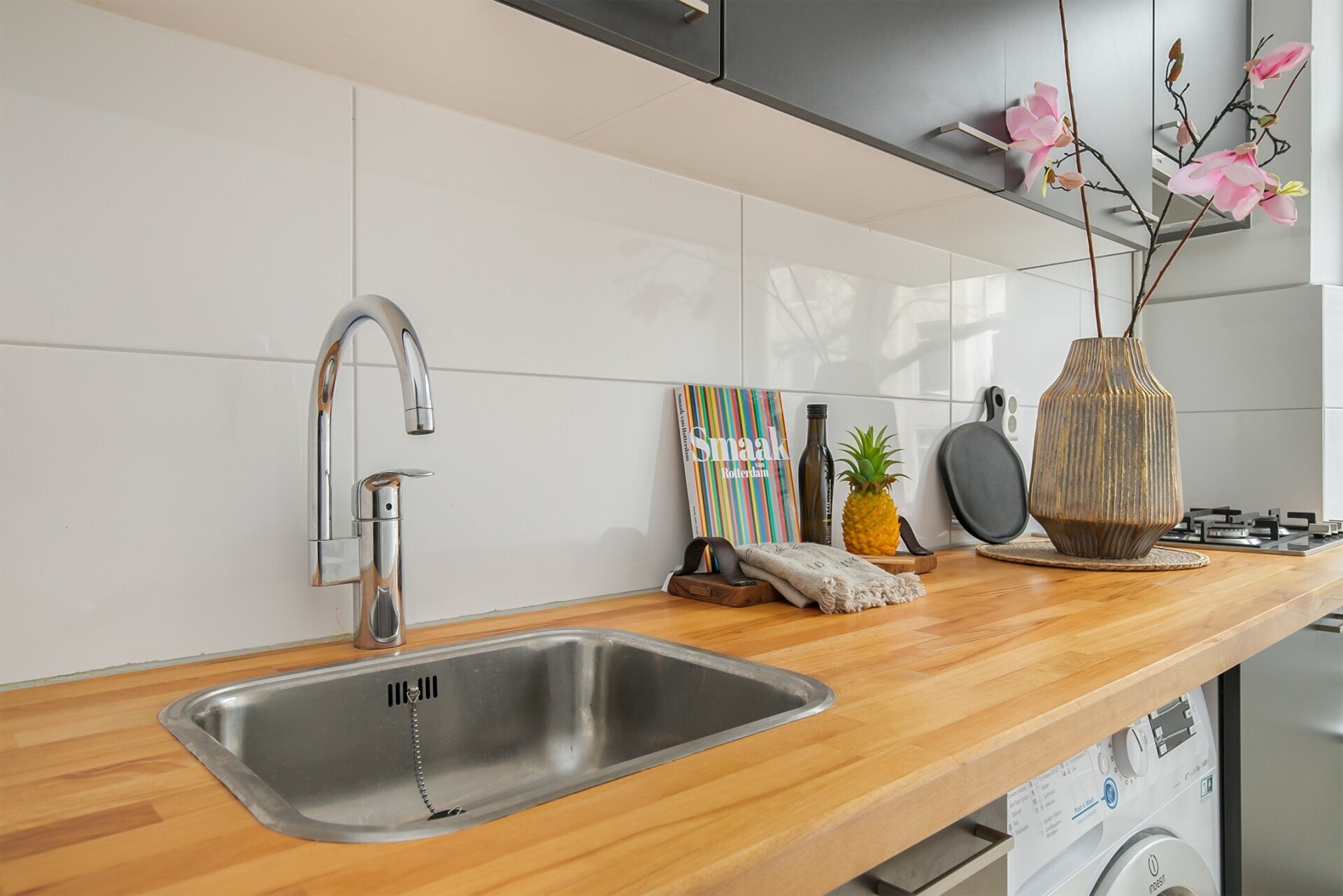 Het ruime balkon ligt op het noorden en biedt een fijne plek om buiten te zitten. Door de ligging aan de achterzijde van het pand geniet je hier van rust en privacy, terwijl de levendigheid van de stad slechts één deur verder is. Een perfecte plek voor een kop koffie in de ochtend of een ontspannen borrel aan het einde van de dag.