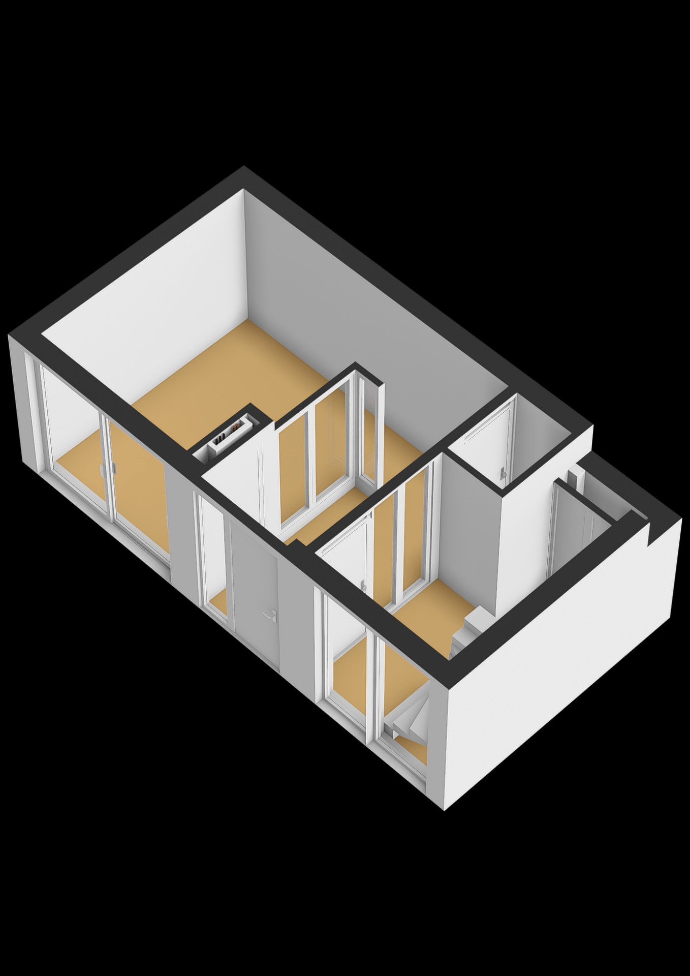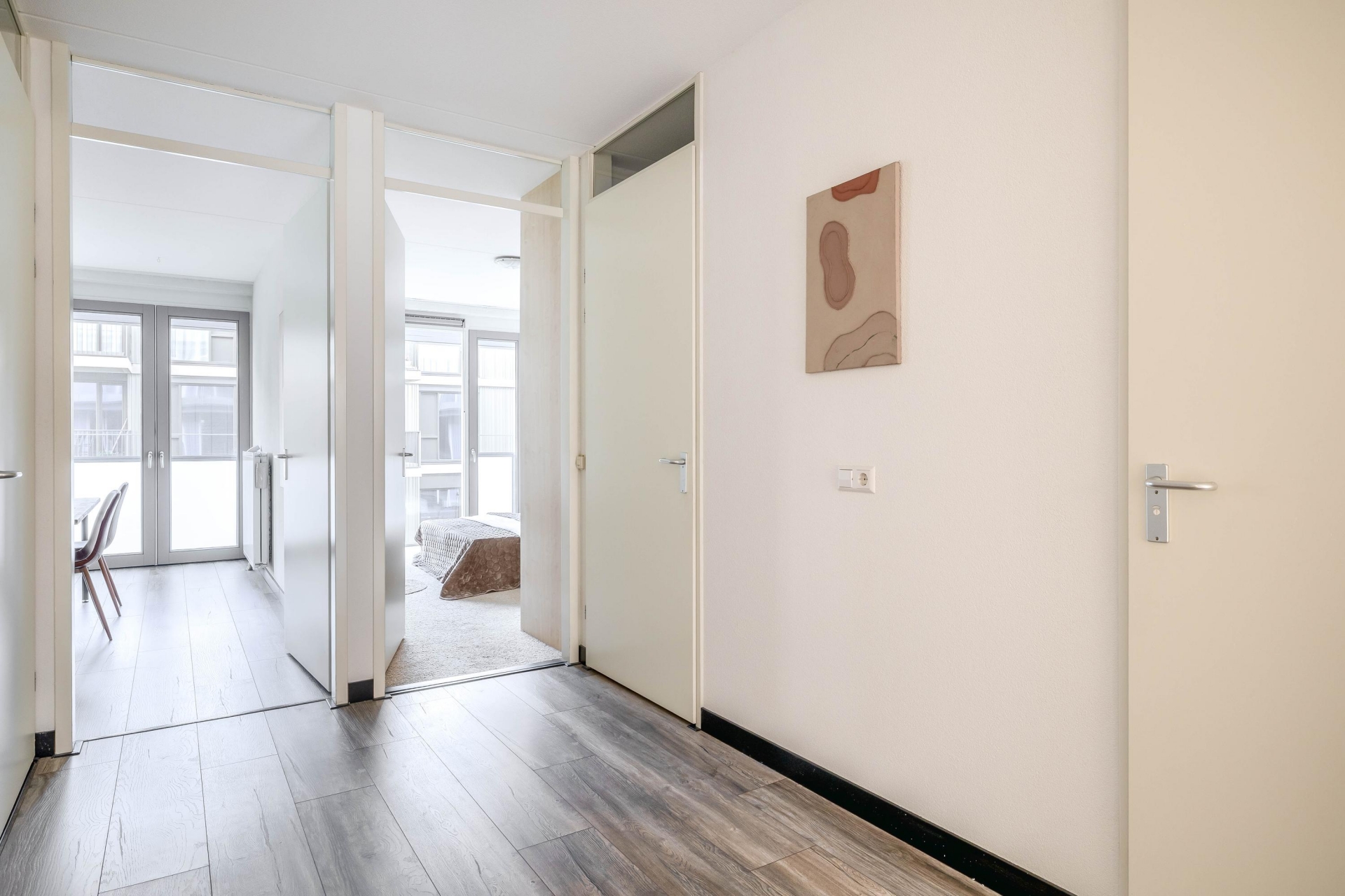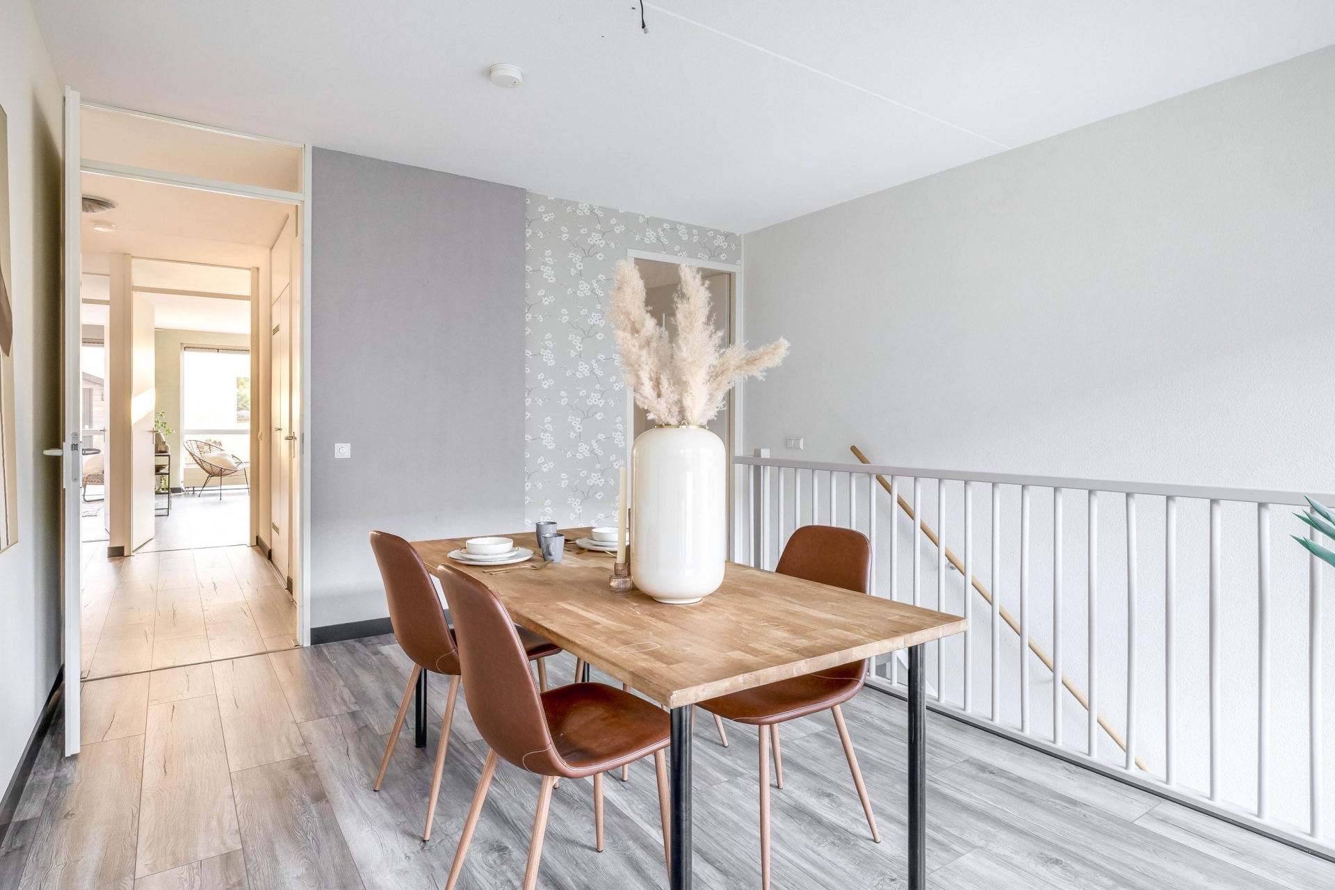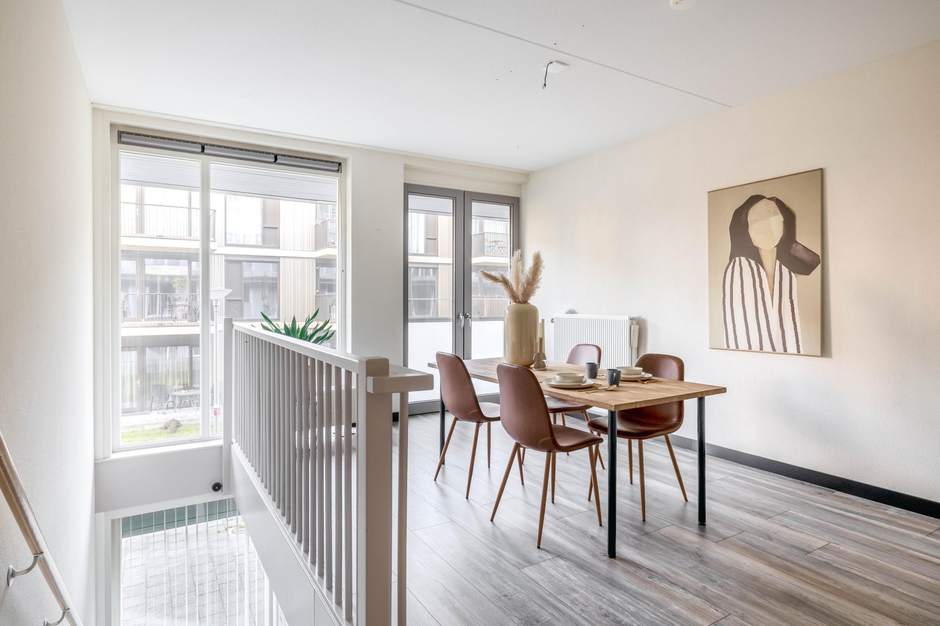 De woonverdieping bevindt zich op de eerste etage, en wat direct opvalt, is de fijne lichtinval door de grote raampartijen aan de achterzijde. De ruime woonkamer staat via een schuifpui in directe verbinding met het riante zonneterras. Deze buitenruimte is een verlengstuk van je leefruimte: hier geniet je in de ochtend van je koffie in de zon of sluit je de dag af met een goed glas wijn in alle rust.