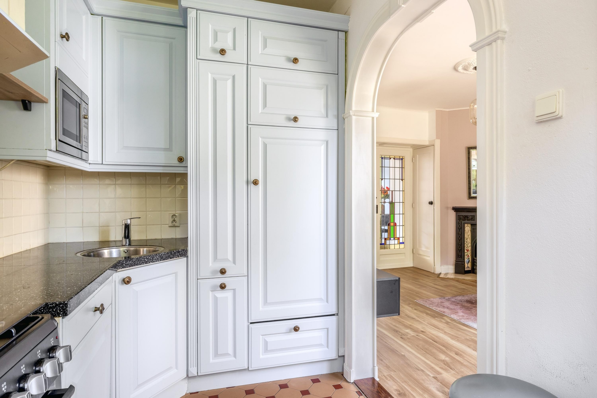 De woonkamer op de eerste verdieping is een sfeervolle en lichte leefruimte, met originele glas-in-lood en suite deuren die de zit- en eethoek op een karakteristieke manier van elkaar scheiden. De voormalige zijkamer is bij de woonkamer getrokken, waardoor er een fijne werkplek is ontstaan, ideaal voor wie regelmatig thuis werkt. De klassieke elementen worden moeiteloos gecombineerd met een moderne afwerking: begin 2025 is vrijwel het hele appartement onder handen genomen. Alleen de keuken en het toilet op deze verdieping zijn niet onder handen genomen, maar dat geeft je meteen de kans om daar je eigen draai aan te geven.